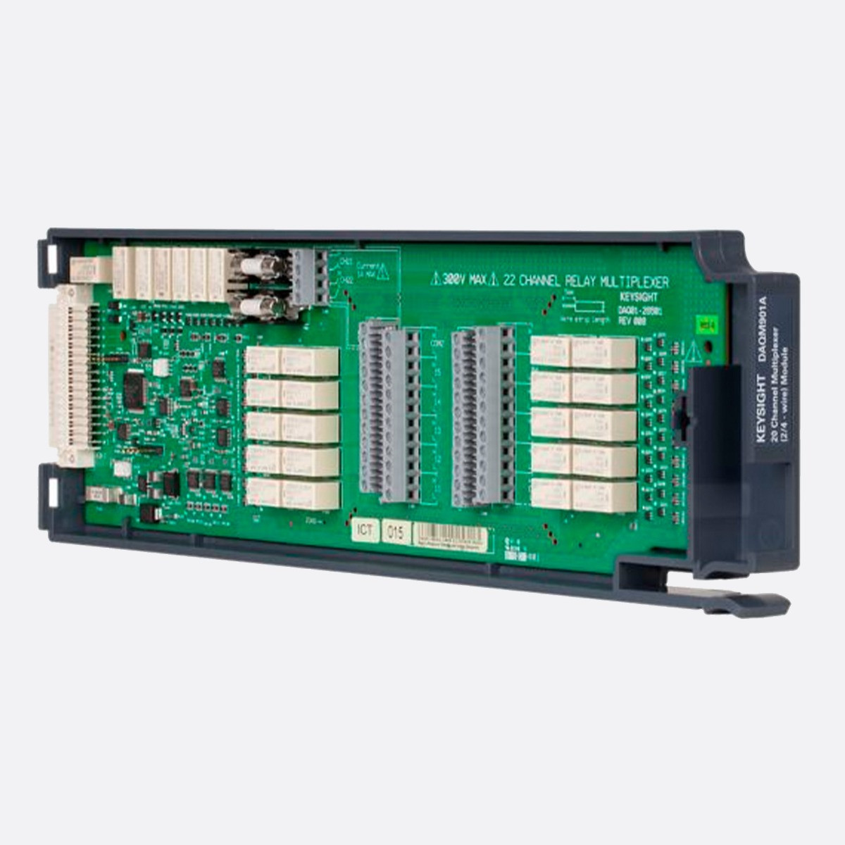 The Keysight DAQM901A is the most versatile multiplexer for general purpose scanning with DAQ970A and DAQ973A Data Acquisition System. It combines dense, multifunction switching with 80-channel/second scan rates to address a broad spectrum of data acquisition applications. Two- and four-wire channels can be mixed on the same module. Two additional fused inputs (22 channels total) route up to 1 A of current to the internal DMM, allowing ac and dc current measurements without the need for external shunt resistors.