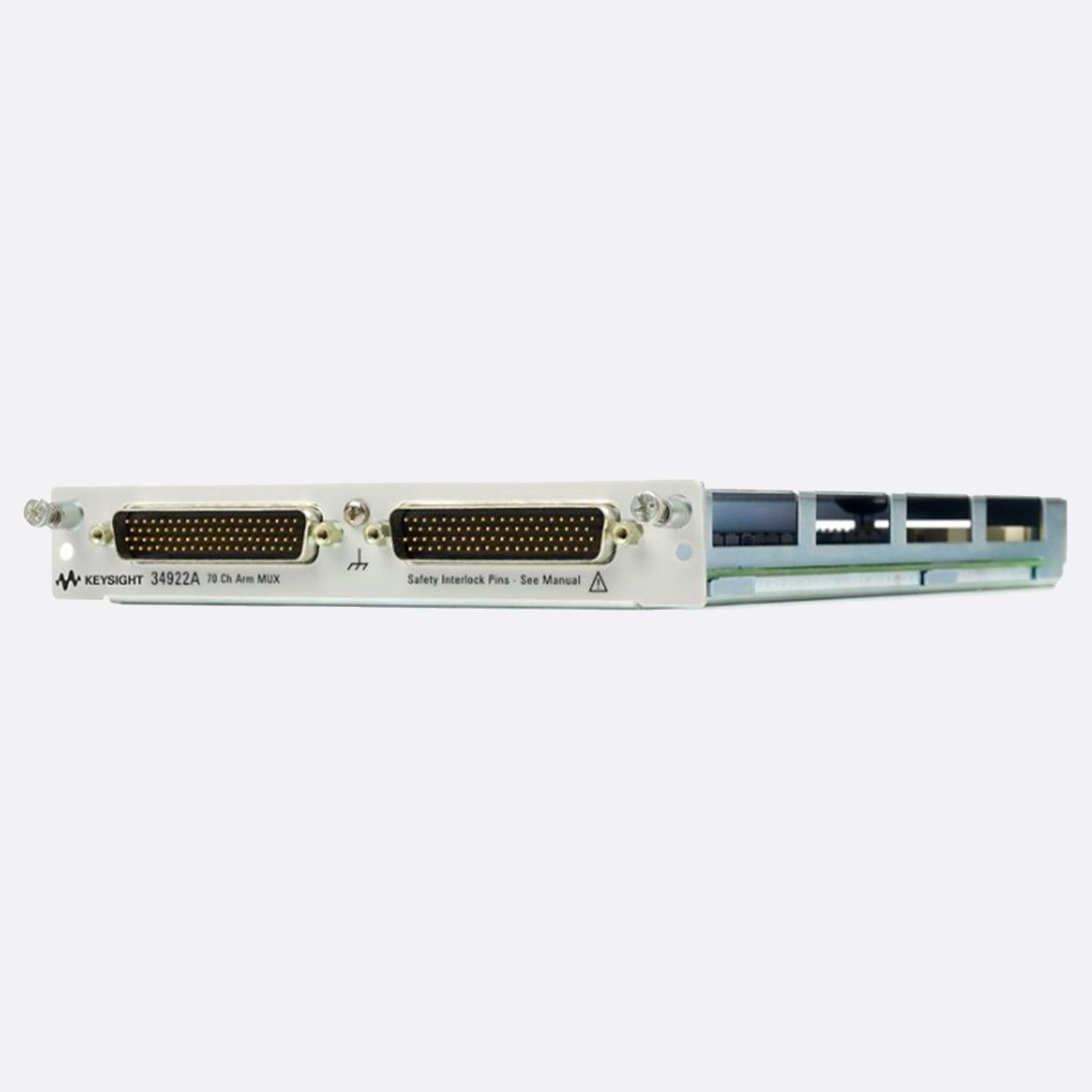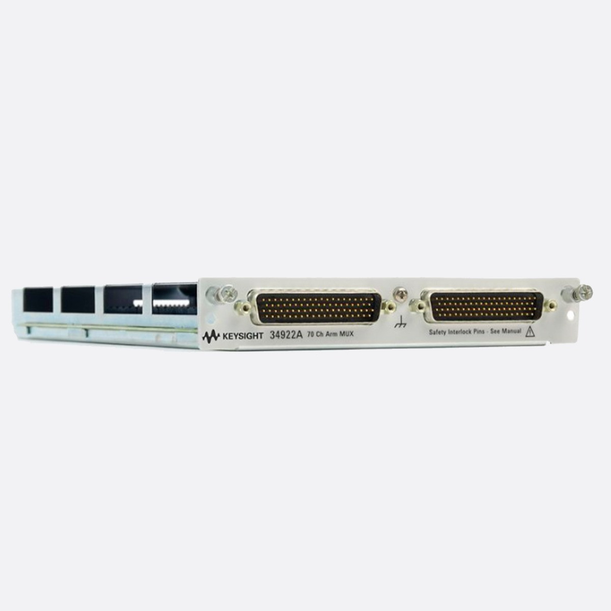 The Keysight 34922A module for the 34980A Multifunction Switch/Measure Unit offers high density multiplexer switching in a compact size. It combines dense, multi-function switching with 100 channel/second scan rates to address a broad spectrum of data acquisition applications. Current measurements can be accomplished with user provided shunt resistors. Standard 78-pin Dsub connectors allow for use with standard cables, terminal blocks, or mass interconnect solutions.