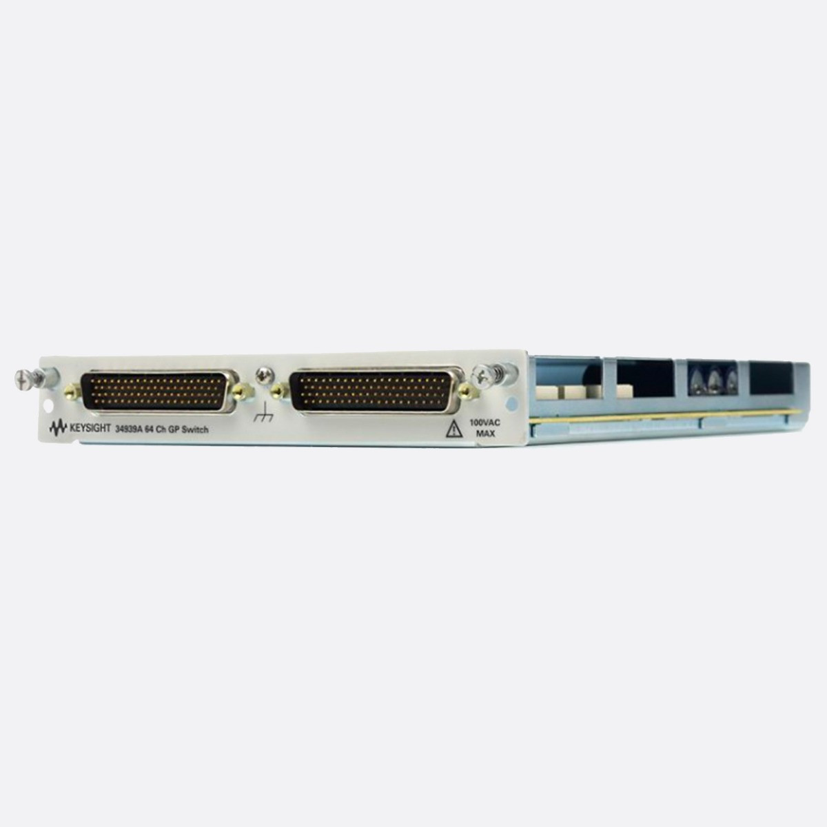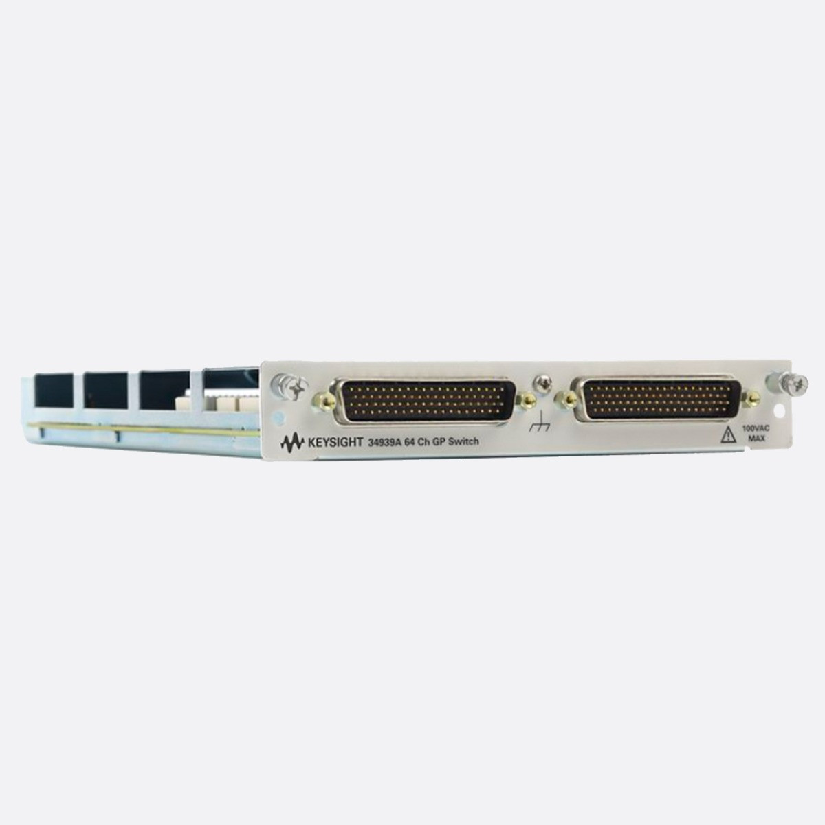 The Keysight 34939A is a high density general-purpose switch module for the 34980A Multifunction Switch/Measure Unit. It has 64 independent single-pole, single-throw (SPST) relays that can switch 1 A and carry 2 A. This module can be used to cycle power to products under test, control indicator and status lights, and to actuate external power relays and solenoids. The relays are 100 V, 1 A contacts and can handle up to 60 W. Standard 78-pin Dsub connectors allow for use with standard cables, screw terminal blocks, or mass interconnect solutions.