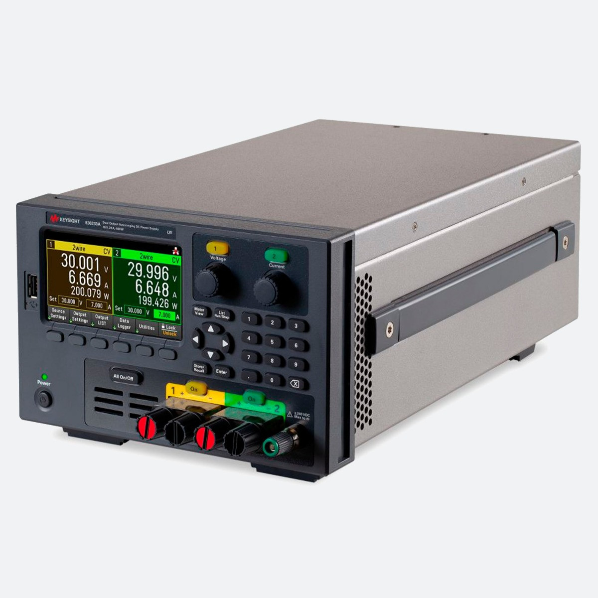 The Power Supply E36233A from Keysight with automatic range selection is the ideal selection for applications where a higher power is required. The two independent 200 W outputs of a dual channel unit can supply up to 400 W. The automatic range selection makes the Power Supply delivering the maximum current at all different voltages. Automatic serial- and parallel-circuit at 2 channel models offer max. voltage or max. current up to a power of 400 W.